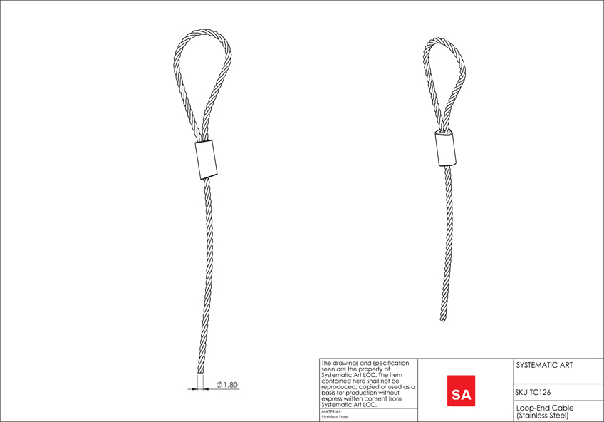 | Description | The Stainless Steel Loop-End Cable can be used in various ways to hang objects and works exceptionally well with both the S-Hook or Molding Hook available in the specialty hardware section of the site. The stainless steel Loop-end Cable can be used with the Slim-Line and Click-Track picture rails when using the ball-end slider hook. The Stainless Steel Loop-End Cable provides exceptional strength for hanging artwork, pictures and objects. This cable can be used with Side Screw hooks, Self-Gripping hooks and attachments. |